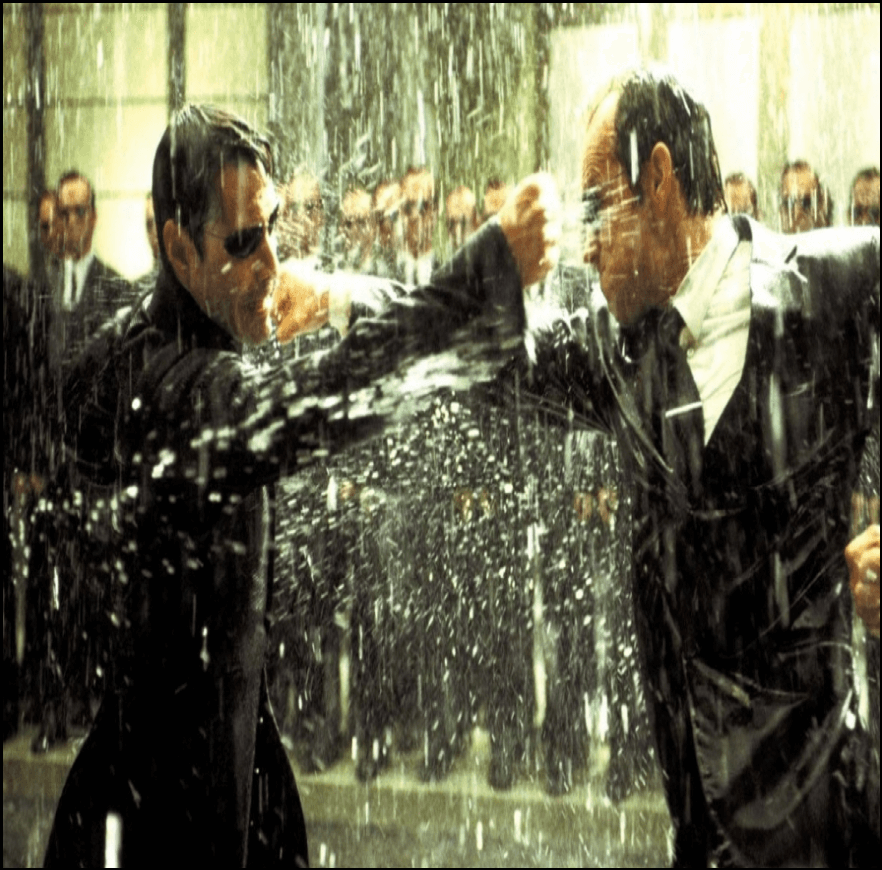 - 네오와 스미스 요원의 대결: 이 장면은 매트릭스 안에서 네오가 스미스 요원과 마지막으로 싸우는 장면입니다. 스미스 요원은 자신과 같은 모습으로 다른 사람이나 AI 요원을 감염시켜서 수백만 명의 복제본을 만들어냅니다. 네오는 수백만 명의 스미스 요원들과 한 판 승부를 벌이는데, 이때 사용되는 액션과 특수효과가 정말 놀랍습니다. 네오와 스미스 요원들이 하늘에서 싸우거나, 빗방울을 멈추거나, 건물을 부수거나 하는 장면은 시청자들의 호흡을 멎게 만듭니다. 이 장면은 상상력이 최대로 동원되어 만들어진, 영화의 클라이막스를 장식하는 대단한 장면입니다.